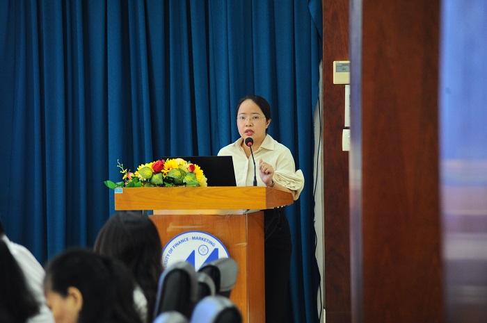 ThS. Nguyễn Trần Tú Anh – Khoa Thương mại và Du lịch trình bày tham luận “Đổi mới phương pháp hướng dẫn và đánh giá kết quả thực tập nghề nghiệp cho sinh viên Ngành Kinh doanh quốc tế bằng giải pháp tích hợp trí tuệ nhân tạo và hồ sơ năng lực điện tử (e-portfolio)”