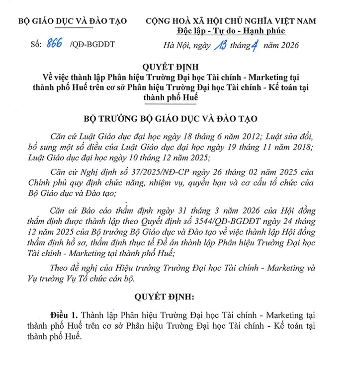 Sáng ngày 13/4/2026, Bộ Giáo dục và Đào tạo vừa ban hành quyết định số 866/QĐ-BGDĐT thành lập Phân hiệu Trường Đại học Tài chính – Marketing (UFM) tại thành phố Huế, đánh dấu bước phát triển quan trọng trong chiến lược mở rộng mạng lưới đào tạo của Nhà trường.