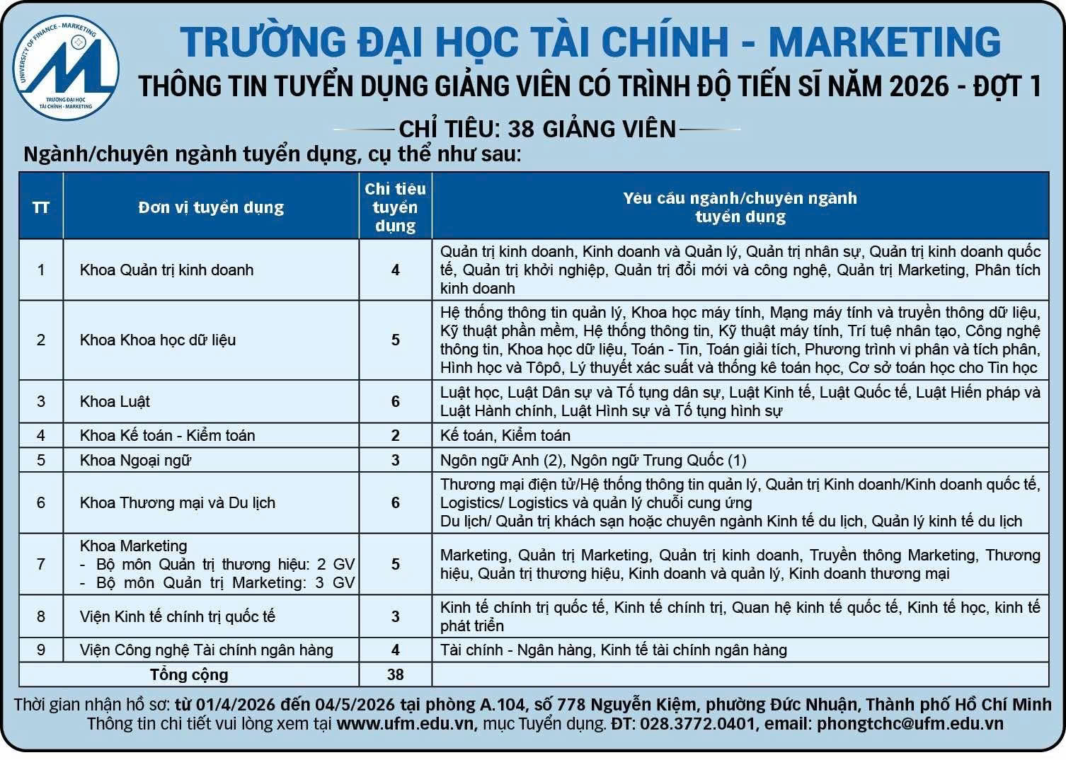 Thông tin Tuyển dụng GV có trình độ Tiến sĩ (Đợt 1 năm 2026)