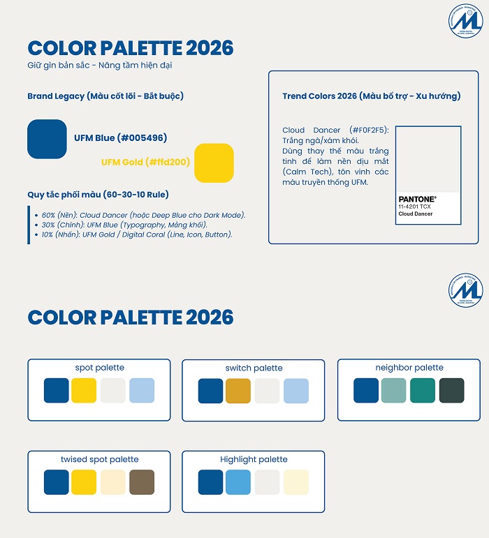 Thứ nhất, về xu hướng màu sắc (Color Palette 2026), UFM tiếp tục sử dụng thống nhất các màu sắc cốt lõi của thương hiệu gồm UFM Blue và UFM Gold, kết hợp với các màu xu hướng, được áp dụng theo quy tắc phối màu 60–30–10 nhằm tạo sự hài hòa, hiện đại và dễ nhận diện.