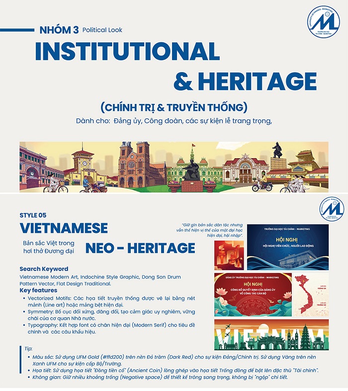 Theo đó, Xu hướng thiết kế UFM 2026 được xây dựng trên định hướng “Giữ gìn bản sắc – Nâng tầm hiện đại”, đóng vai trò là cơ sở thống nhất cho việc thiết kế và sản xuất các ấn phẩm truyền thông của UFM trong năm 2026.